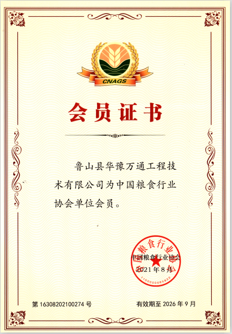 2021年8月,中国粮食行业协会经多方位考察,授予鲁山县Ag尊龙凯时工程技术有限公司评会员单位称号,并颁发会员单位证书。